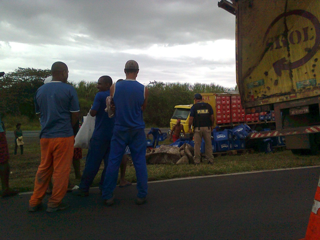 Agora há pouco na BR 323 – Oeste (Salvador – Feira de Santana) um caminhão da Skol derramou sua carga sobre o canteiro central da rodovia na altura do KM 559, causando retenção no tráfego em virtude da curiosidade dos condutores. A PF já se encontrava no local registrando a ocorrência. No sentido contrário (Leste) o tráfego continua normal.
