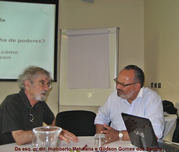 Acima o biólogo Humberto Maturana conversa com o advogado Gildson Gomes, em Santiago do Chile