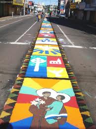 A tradição de enfeitar as ruas começou pela cidade de Ouro Preto em Minas Gerais. A procissão pelas vias públicas, é uma recomendação do Código de Direito Canônico que determina ao Bispo Diocesano que tome as providências para que ocorra toda a celebração, para testemunhar a adoração e veneração para com a Santíssima Eucaristia.