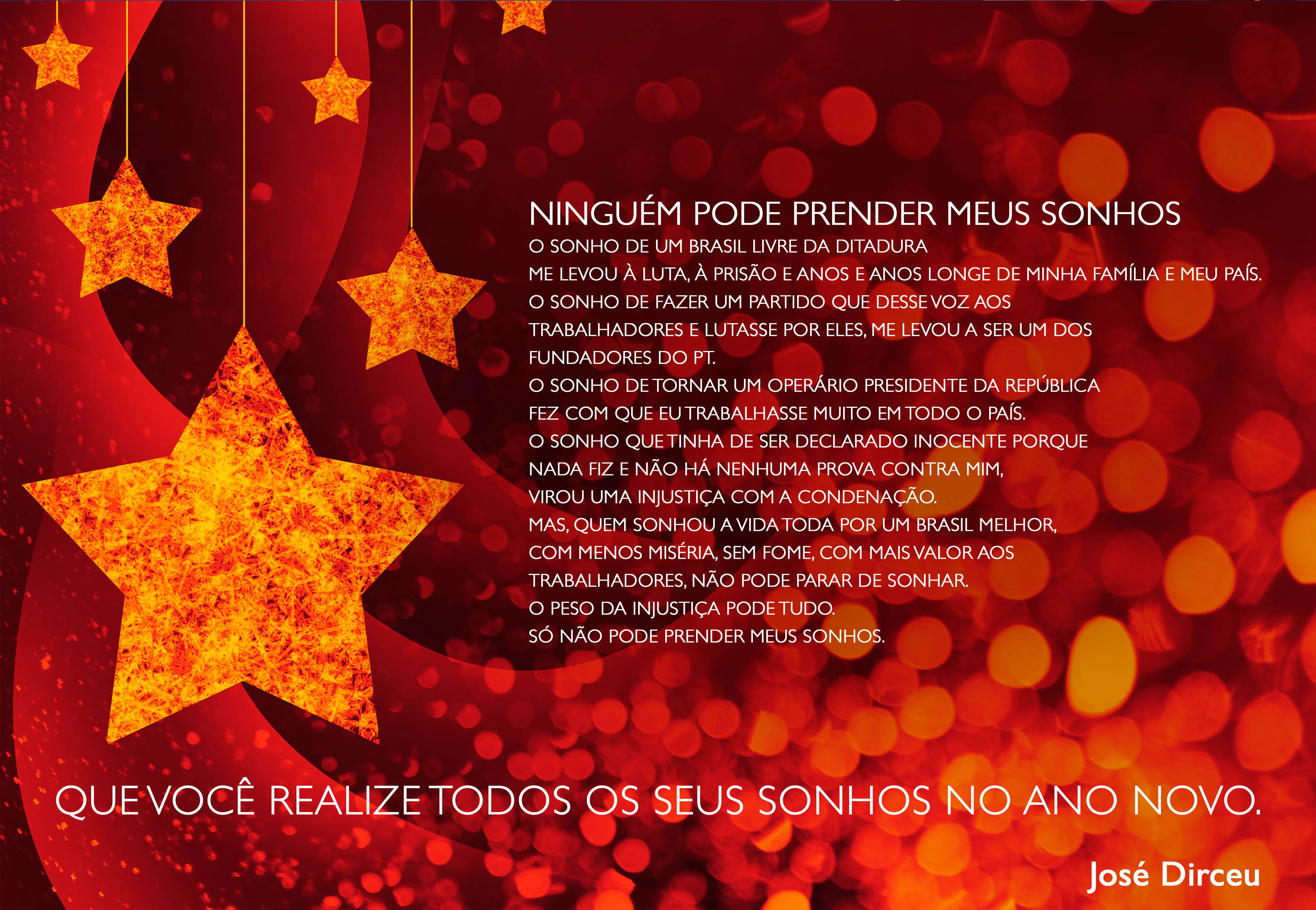 A surpresa ficou por conta de José Dirceu, que ainda não conformado com a prisão, reafirmou sua condição de inocência. Em mensagem de fim de ano publicada ontem no blog que mantém, Dirceu disse que “nada fez” e se trata de uma “injusta prisão”. Veja abaixo mensagem na íntegra: